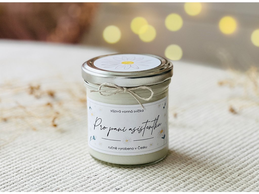 Obdarujte svou oblíbenou asistentku na závěr školního roku, v pololetí nebo na Vánoce jedinečným a osobním dárkem. Pro tuto speciální příležitost jsme vytvořili přírodní sójovou svíčku, která je pečlivě umístěna ve stylové 165 ml skleněné nádobě s elegantním víčkem. Svíčka vyzařuje jemnou květinovou vůni, evokující kvetoucí jarní zahradu, a navozuje atmosféru klidu a relaxace. Díky bavlněnému knotu hoří rovnoměrně a dlouho, což z ní činí ideální dekoraci pro jakýkoli domov. Představte si, jak tato vonná svíčka prozáří pracovní stůl nebo domov vaší asistentky, přinášející radost s každým jemným plamínkem.
