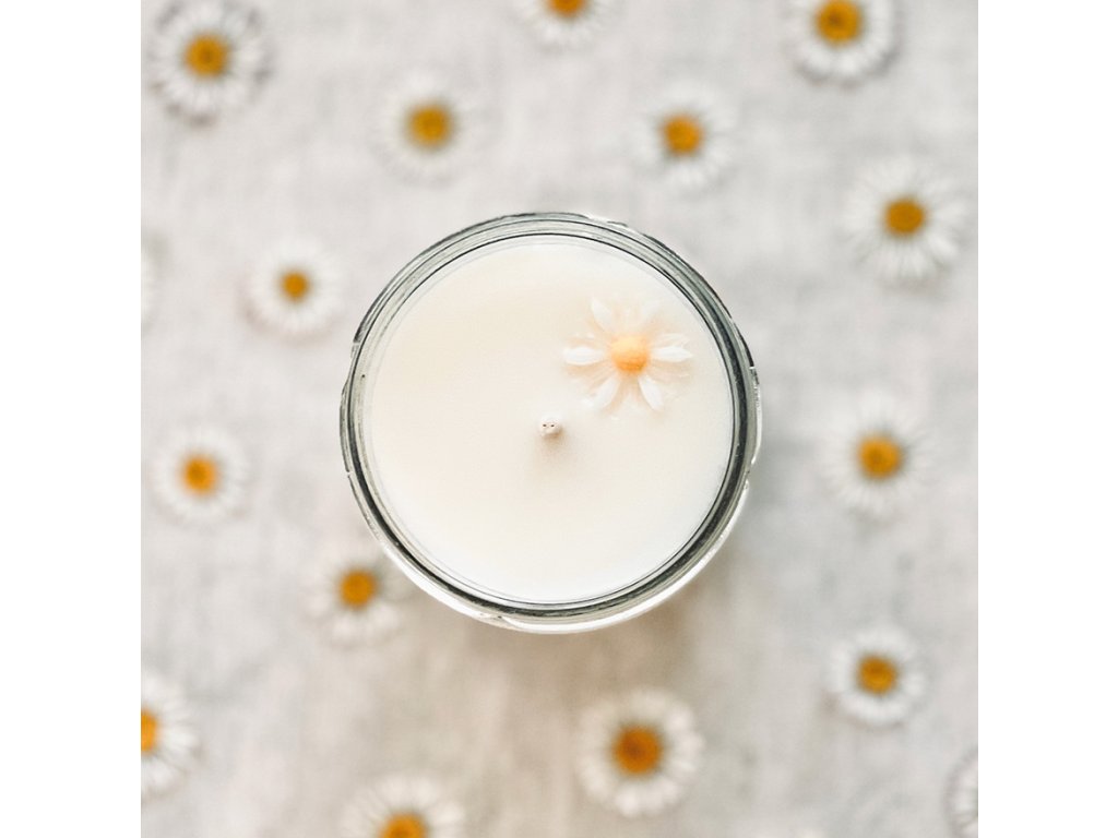 Přírodní sójová dekorativní svíčka ve 160 ml skle s nádhernou květinovou vůní, voskovým květem sedmikrásky, bavlněným knotem a stylovým víčkem.