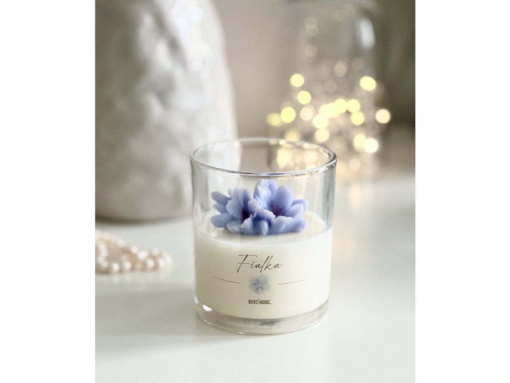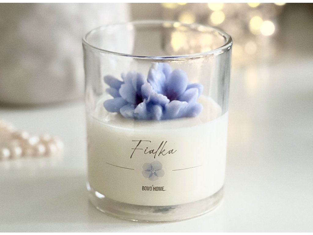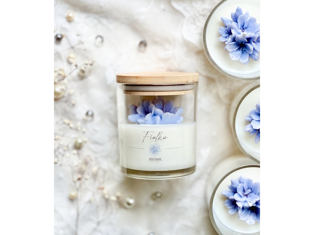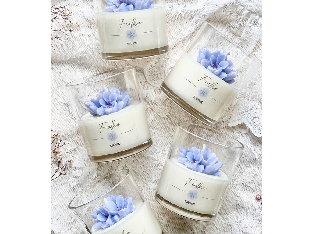 Ručně odlitá přírodní sójová svíčka s bavlněným knotem, zdobená nádhernou voskovou květinou, přináší jemnou a podmanivou vůni fialky. Její květinové aroma navodí pocit klidu, něhy a harmonie a promění každý prostor v rozkvetlou zahradu.