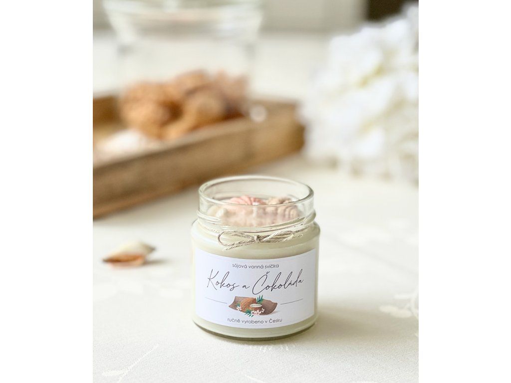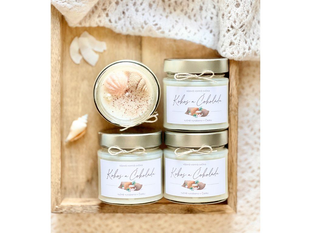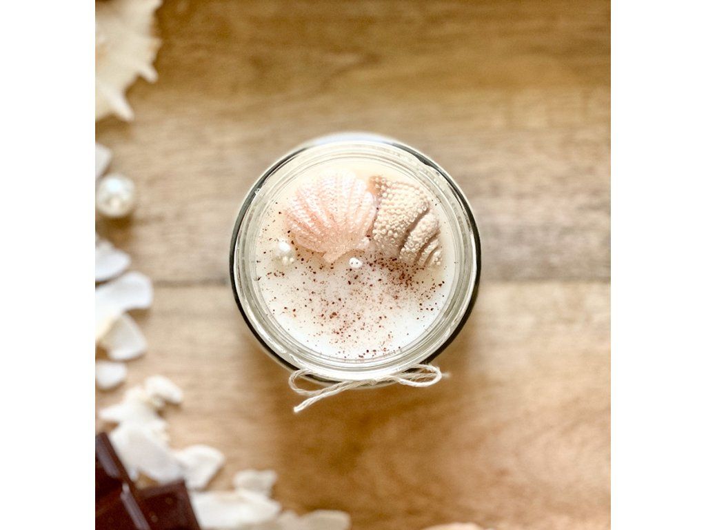 Vůně kokosu a čokolády v sobě spojuje jemnou exotickou sladkost a hřejivě lahodný charakter. Hebké tóny kokosu se prolínají s plnou vůní čokolády a vytvářejí útulnou atmosféru plnou pohody, sladkého potěšení a chvil, které si budete chtít vychutnat naplno. Tato vůně krásně provoní domov, pohladí smysly a promění obyčejný den v okamžik plný tepla a voňavé harmonie. Díky elegantnímu vzhledu a zdobení v podobě strouhané čokolády, skleněné perly a mušlí z vosku je svíčka zároveň i krásným dárkem pro každého, kdo miluje sladké, originální a nápadité vůně.