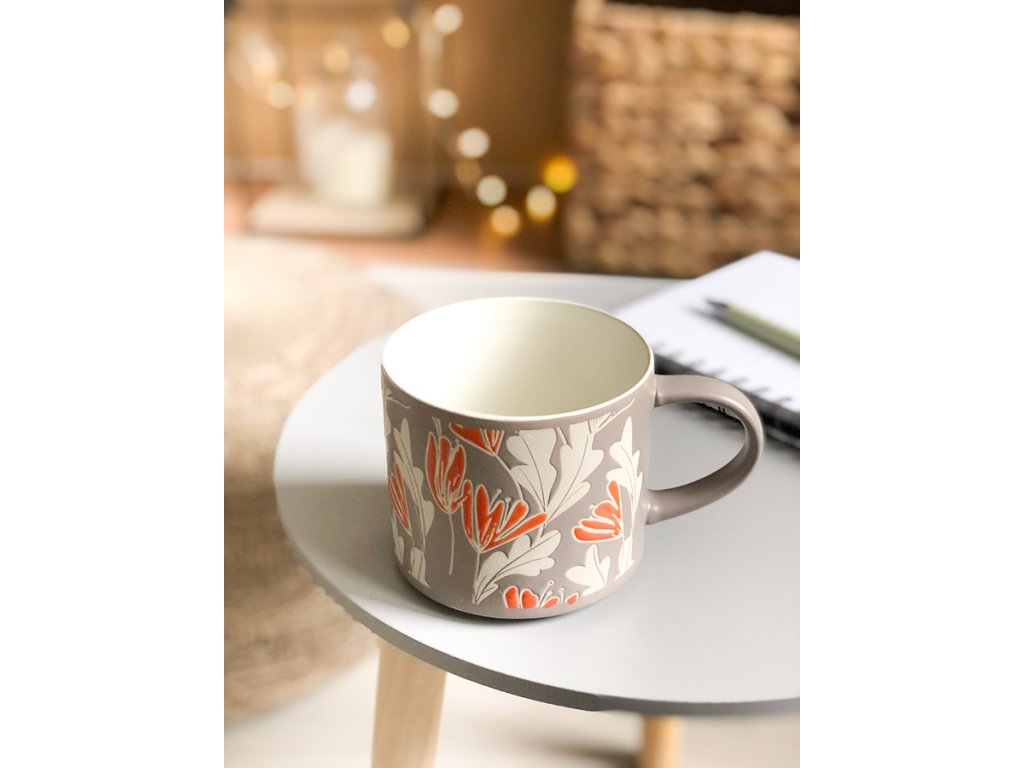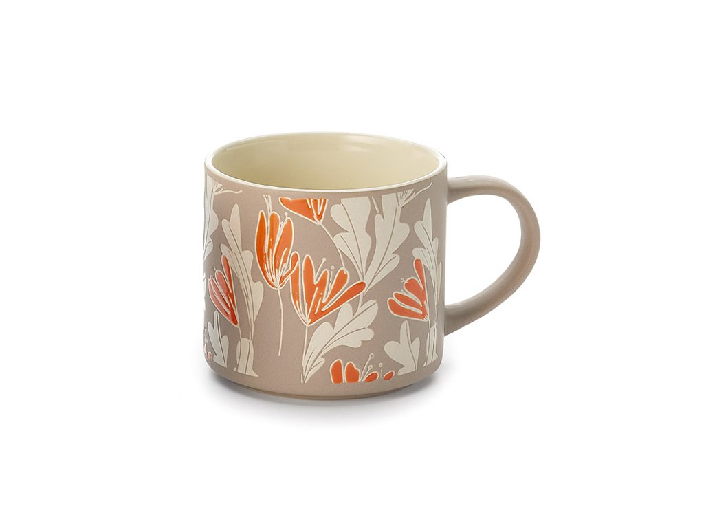 Středně velký hrnek z prémiové keramiky s podkladem v béžové barvě s přírodními motivy listů a oranžových květů. Hrnek se dobře drží a je stabilní je vhodný pro teplé i studené nápoje. stupně základní školy.