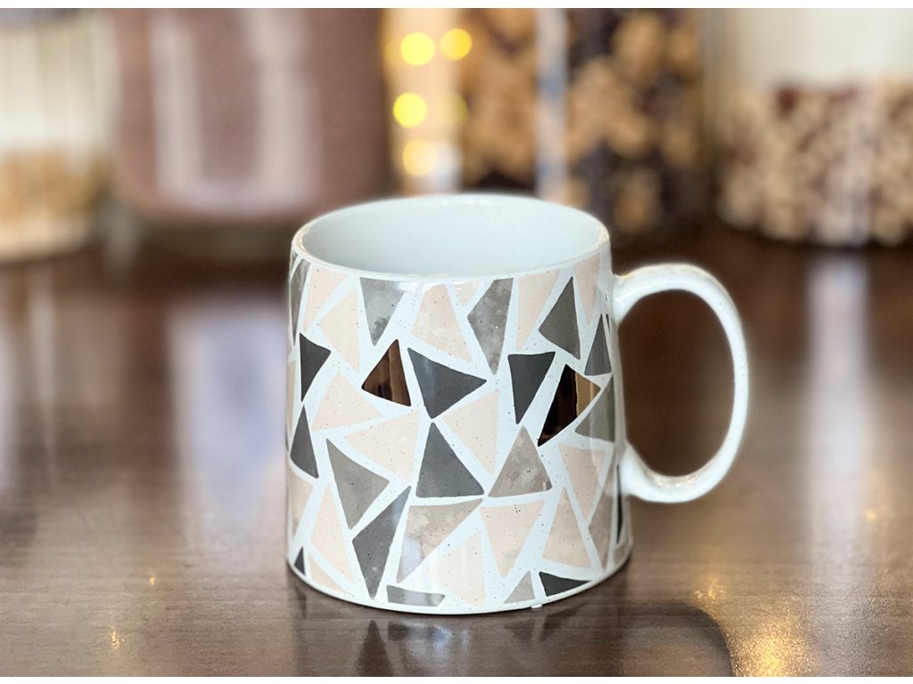 Stylový keramický hrnek s originálním mozaikovým designem trojúhelníků v jemných neutrálních tónech béžové, bílé a šedé. Moderní vzor mu dodává elegantní, lehce skandinávský nádech, díky kterému krásně zapadne do každého interiéru.