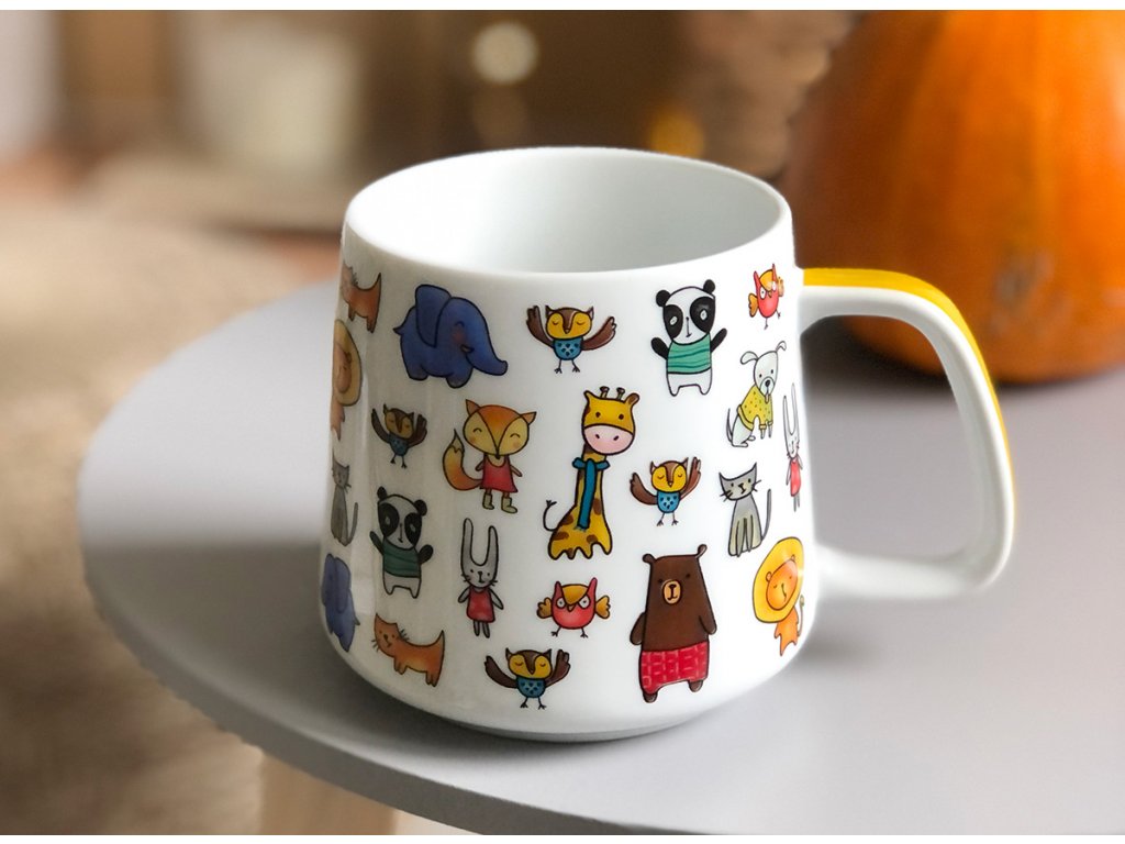 Žádná nuda, ale zábavné dodržování správného pitného režimu pro děti se středně velkým porcelánovým barevným dětským hrnkem se zvířátky, který je opatřen pevným uchem. Ranní kakao s pandou nebo lvem, dopolední svačinka se psem, oběd se zajícem nebo sovou, odpolední svačinka se žirafou a večerní neslazený čaj se slonem nebo liškou.