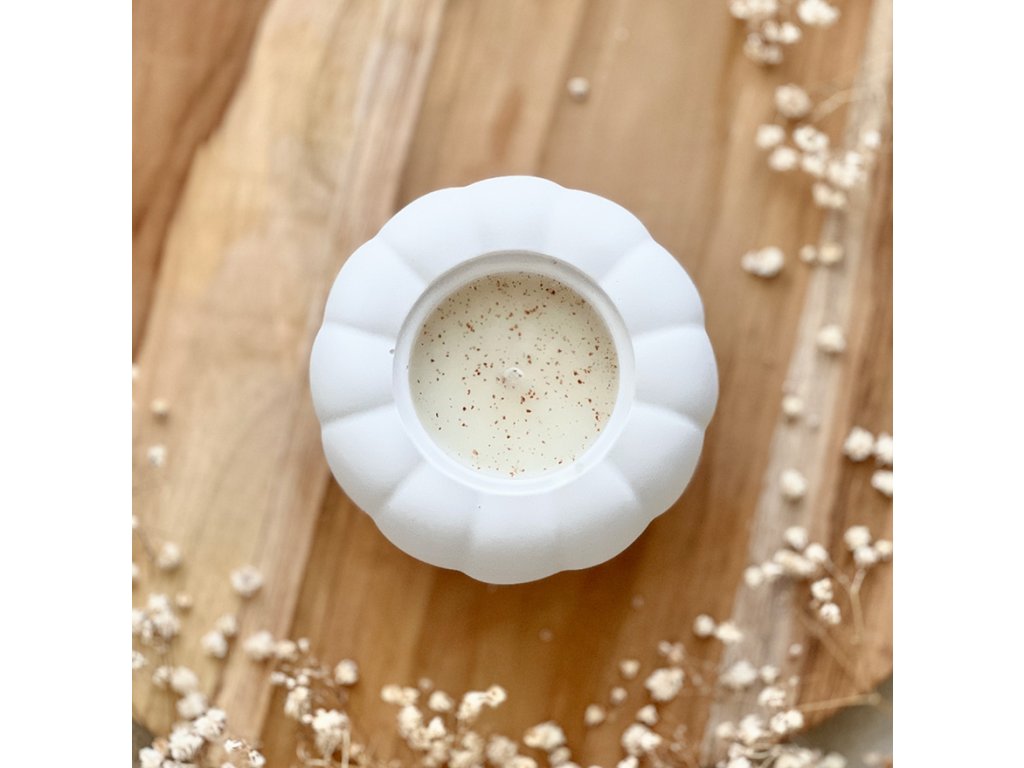 Každý obal je ručně odlévaný s jemnou povrchovou strukturou, vysokou pevností a dlouhou životností. Uvnitř se nachází přírodní sójový vosk s bavlněným knotem a jemným posypem skořice, který podtrhuje přirozený charakter svíčky. Sladce kořeněná kombinace vanilky a skořice vytváří harmonickou vůni plnou tepla, klidu a domácké pohody – ideální pro podzimní večery při tlumeném světle svíček.