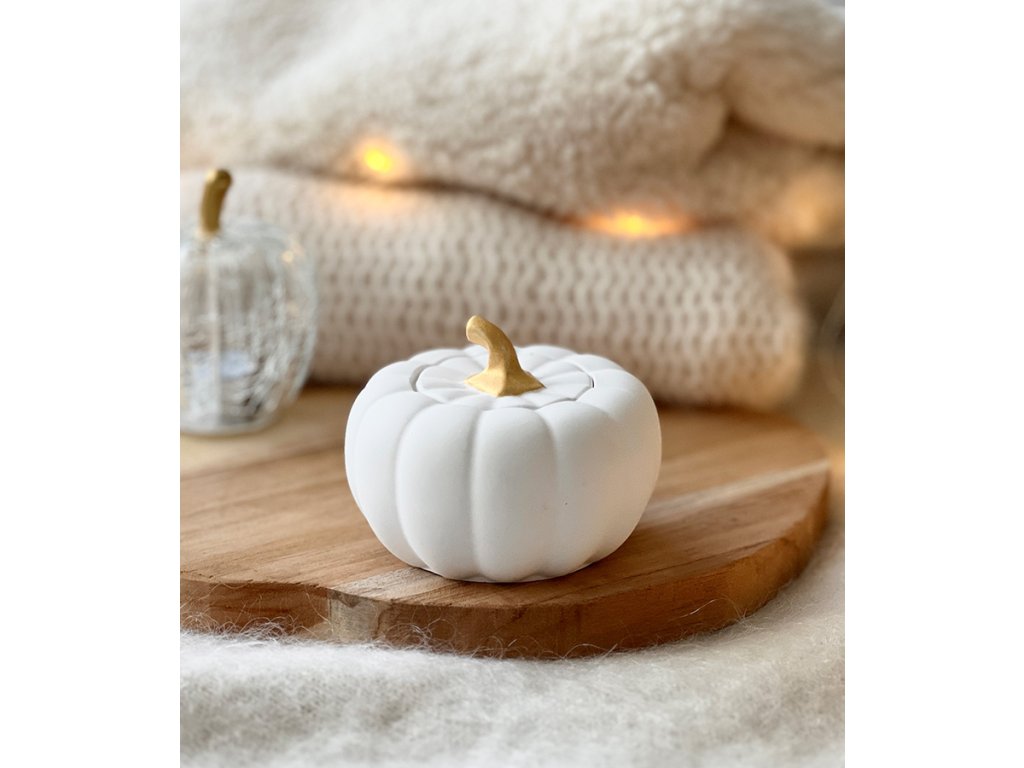 Matně bílý povrch dýně kontrastuje se zlatou stopkou, která dodává svíčce elegantní a luxusní vzhled. Díky tomu se stává nejen vonným doplňkem, ale i výrazným designovým prvkem, který ozdobí váš interiér během podzimu i zimy.