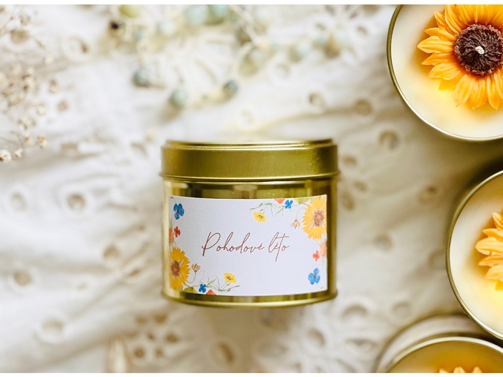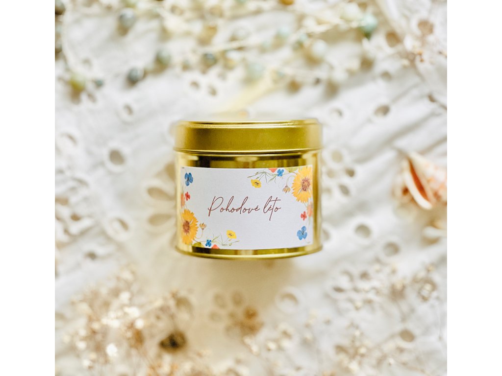 Užijte si nejen bezstarostné letní dny se sójovou svíčkou Pohodové léto ve zlatě zbarveném kovovém obalu s víčkem. Okouzlí vás jemná vůně lipového květu v harmonickém spojení se sladkou meruňkou – lehká, šťavnatá a plná slunce.