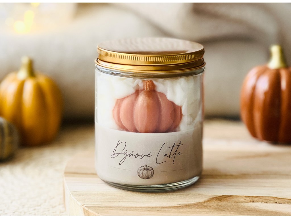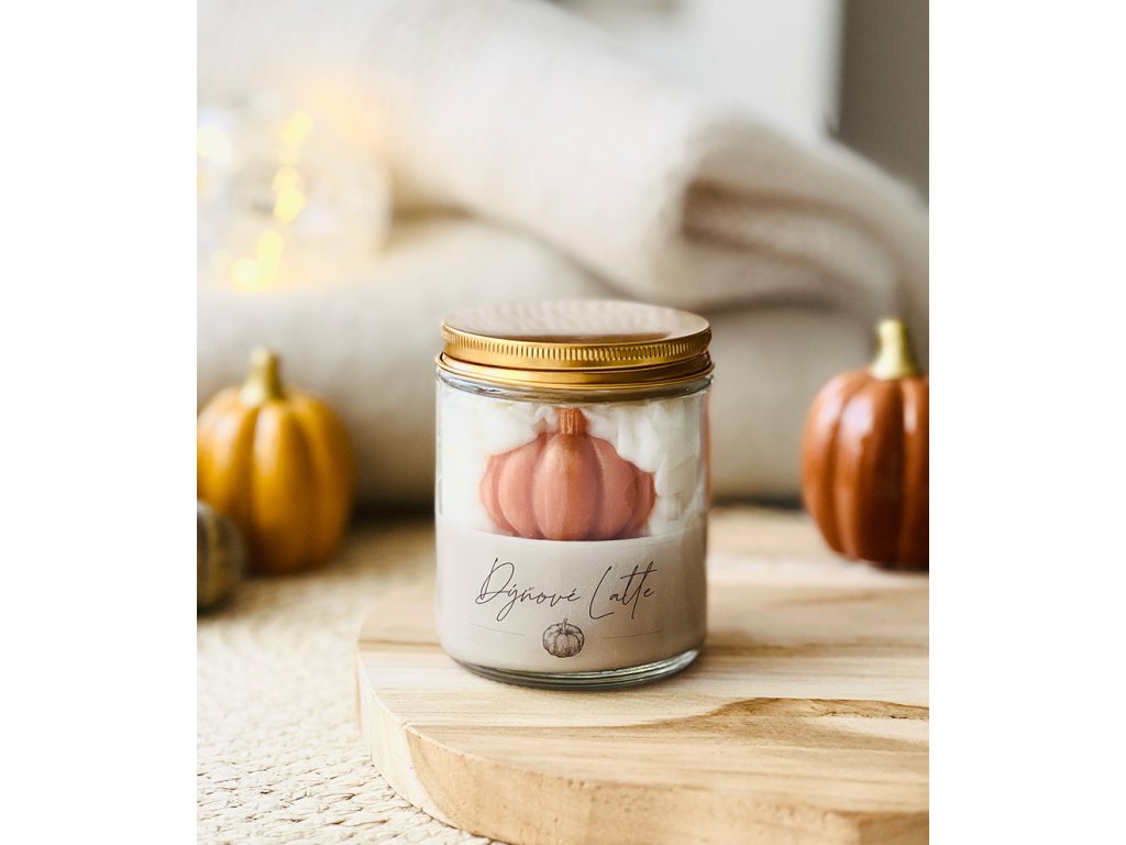 - Svíčku s příjemnou vůní dýňového koření s tóny kávy a mléčné pěny.