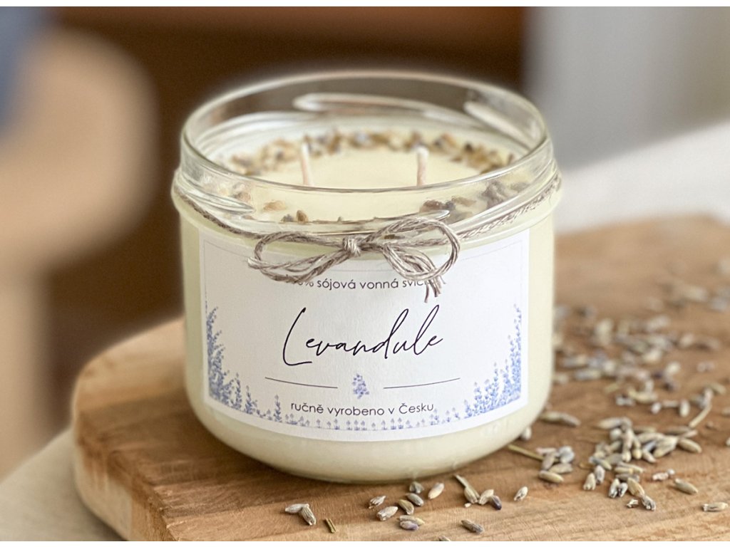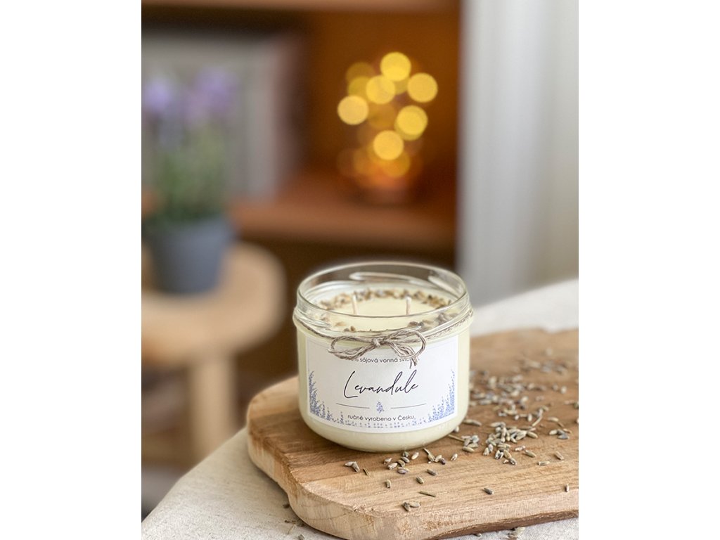 100% přírodní sójová dekorativní svíčka ve 200 ml skle s vůní levandule, okrasným zdobením, dvěma knoty, víčkem a dobou hoření více než 50 hodin.