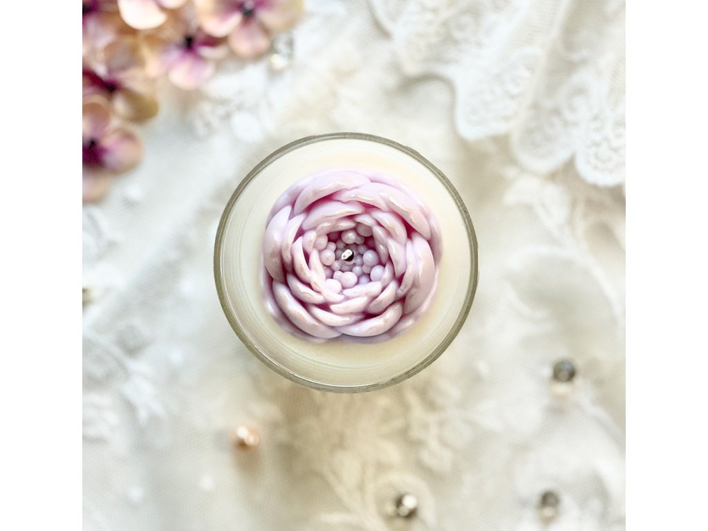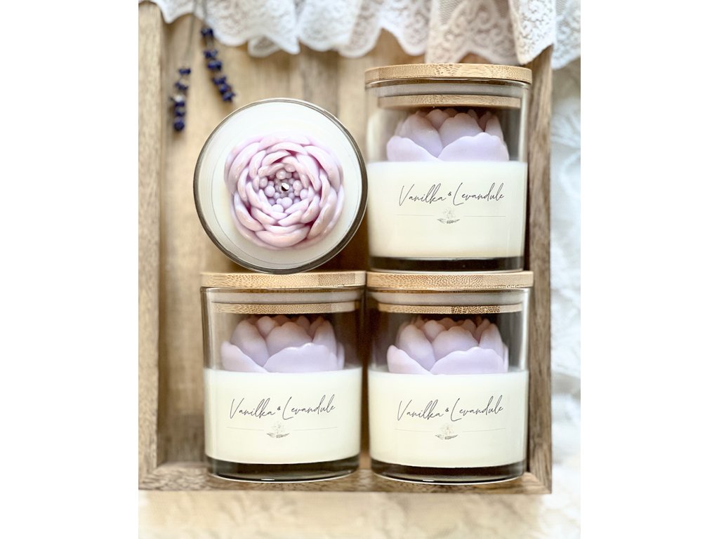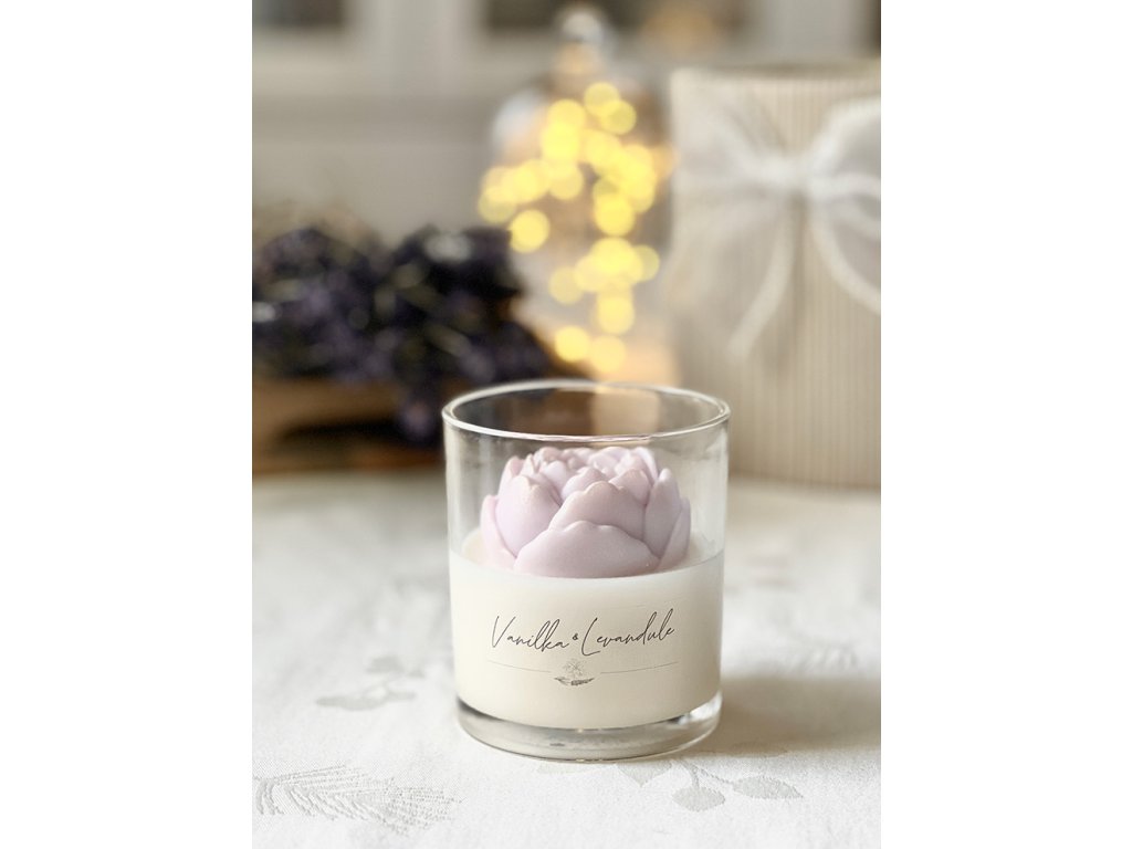 Ručně odlitá přírodní sójová svíčka s bavlněným knotem, zdobená nádhernou voskovou květinou lehce dekorovanou zlatým práškem, přináší harmonickou vůni vanilky a levandule. Tato jedinečná kombinace propojuje hřejivou sladkost vanilky s uklidňující bylinnou svěžestí levandule, čímž vytváří atmosféru klidu a pohody.