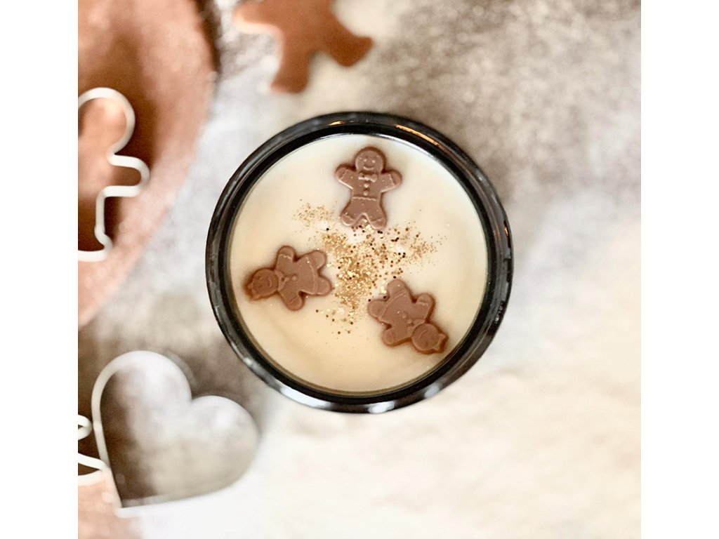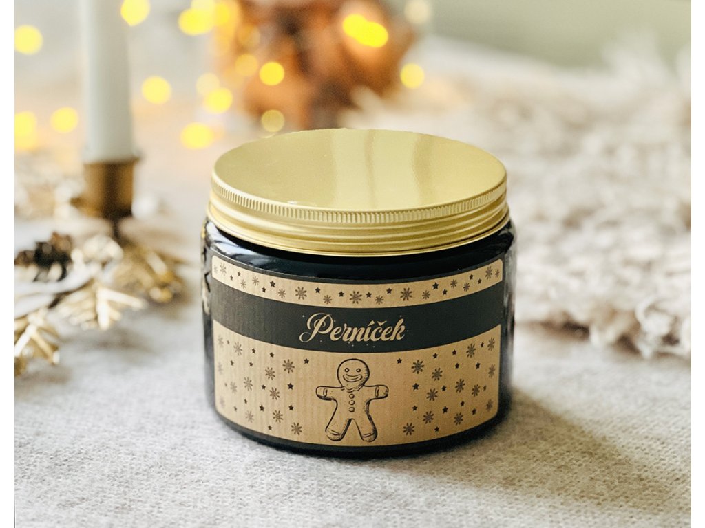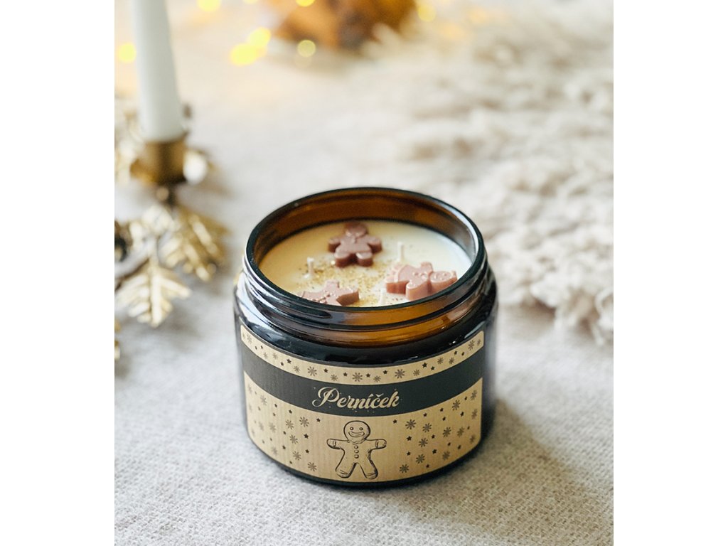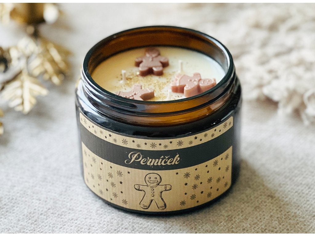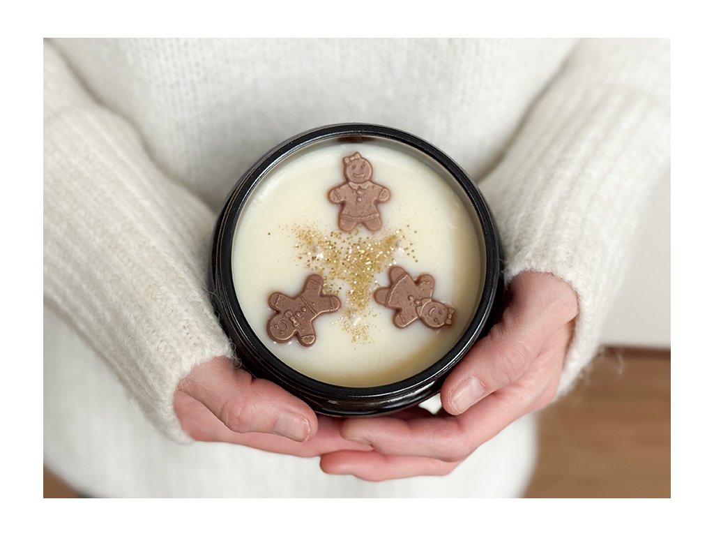 Velká 450 gramová sójová svíčka s vůní perníkového koření v elegantním tmavém skle se zlatým víčkem, se třemi knoty. Povrch svíčky zdobí tři perníčky z vosku, jemně doplněné zlatým vánočním dekorem, který dodává celé svíčce slavnostní a hřejivý vzhled.