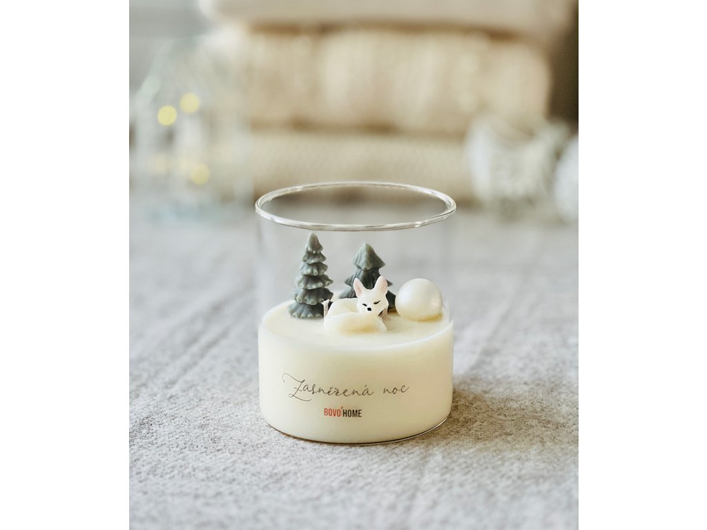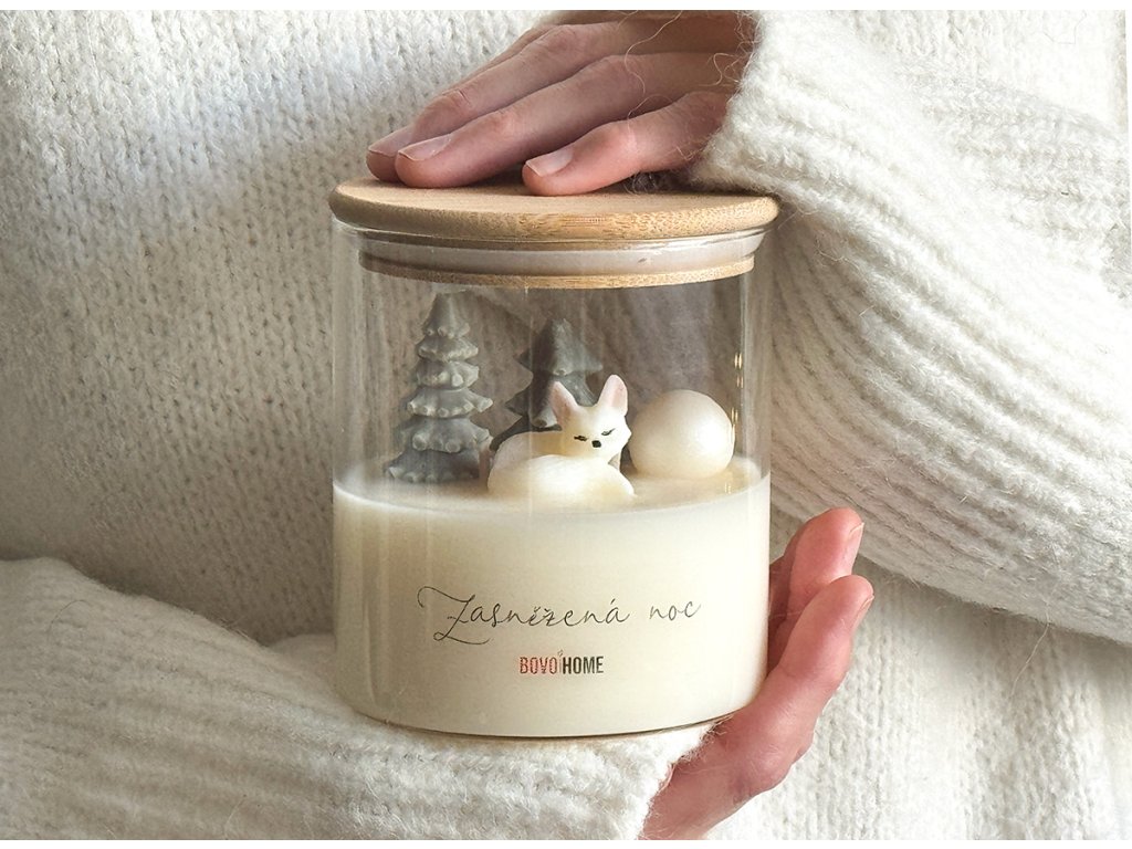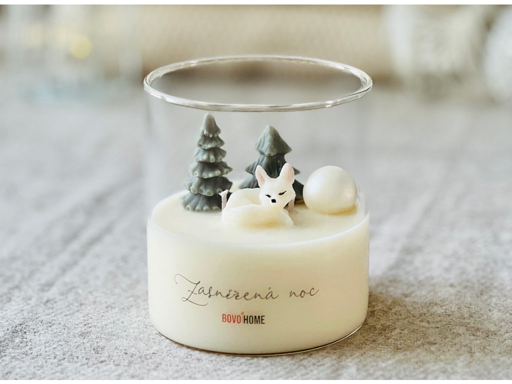 Svíčka je ručně odlévaná do skleněné dózy s bambusovým víčkem a zdobená detailními voskovými dekoracemi polární lišky, jehličnatých smrků a sněhové koule, které připomínají tichou zimní krajinu. Díky svému designu slouží nejen jako zdroj světla a vůně, ale i jako výrazný dekorativní prvek nebo originální dárek.
