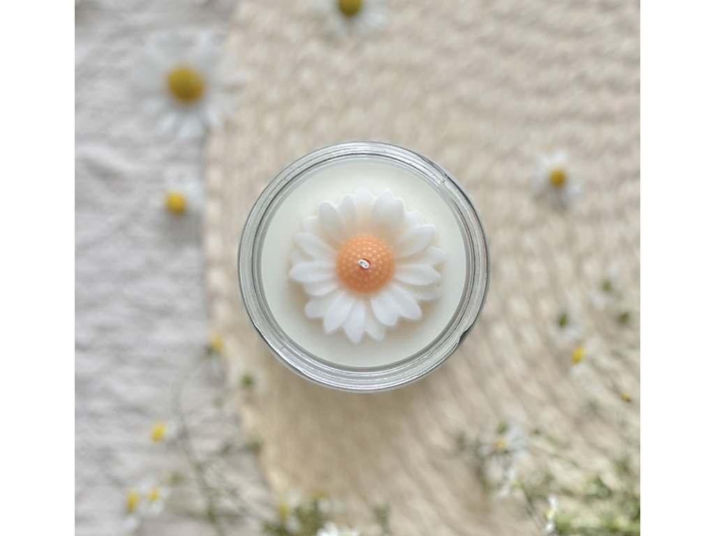 Bylinná přírodní sójová svíčka s bavlněným knotem, dekorována velkou květinou z vosku, vůní uklidňujícího heřmánku ve 330 ml průhledné sklenici se stylovým víčkem s dobou hoření více než 50 hodin.