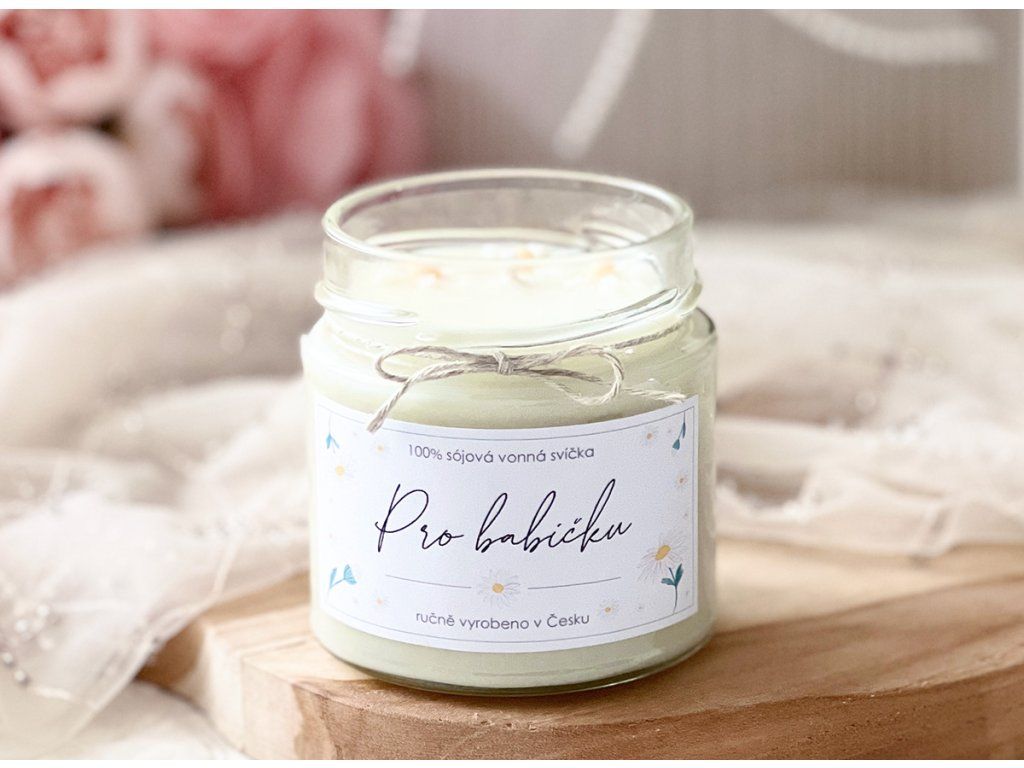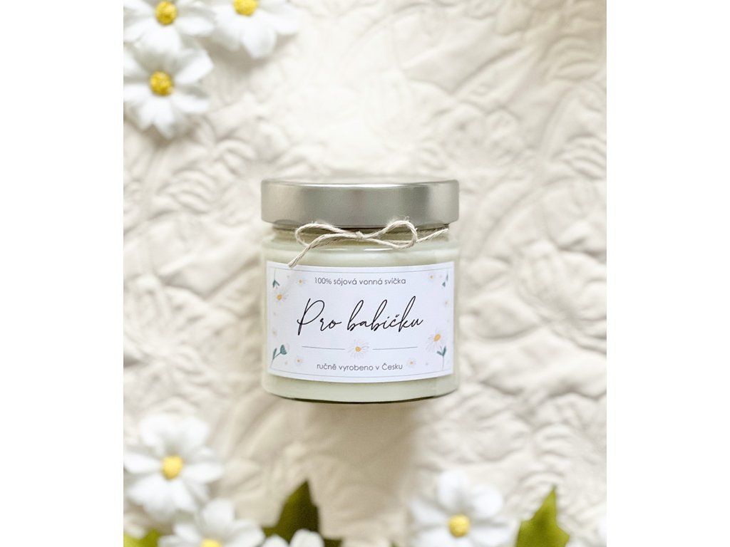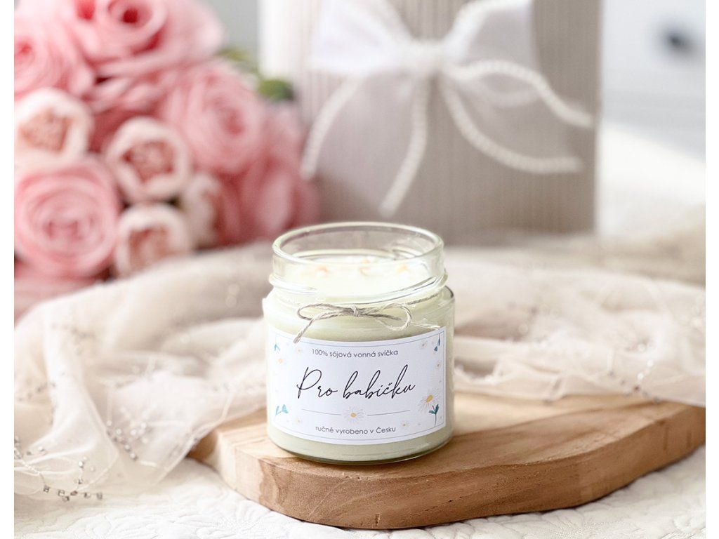 Nejen slova, ale i milý dárek, přímo do srdce může vaši babičku potěšit. Pro tuto příležitost jsme si pro vás připravili 100% přírodní svíčku s jemně půvabnou květinou vůní, něžně zdobenou sušenými květy jarní sedmikrásky.