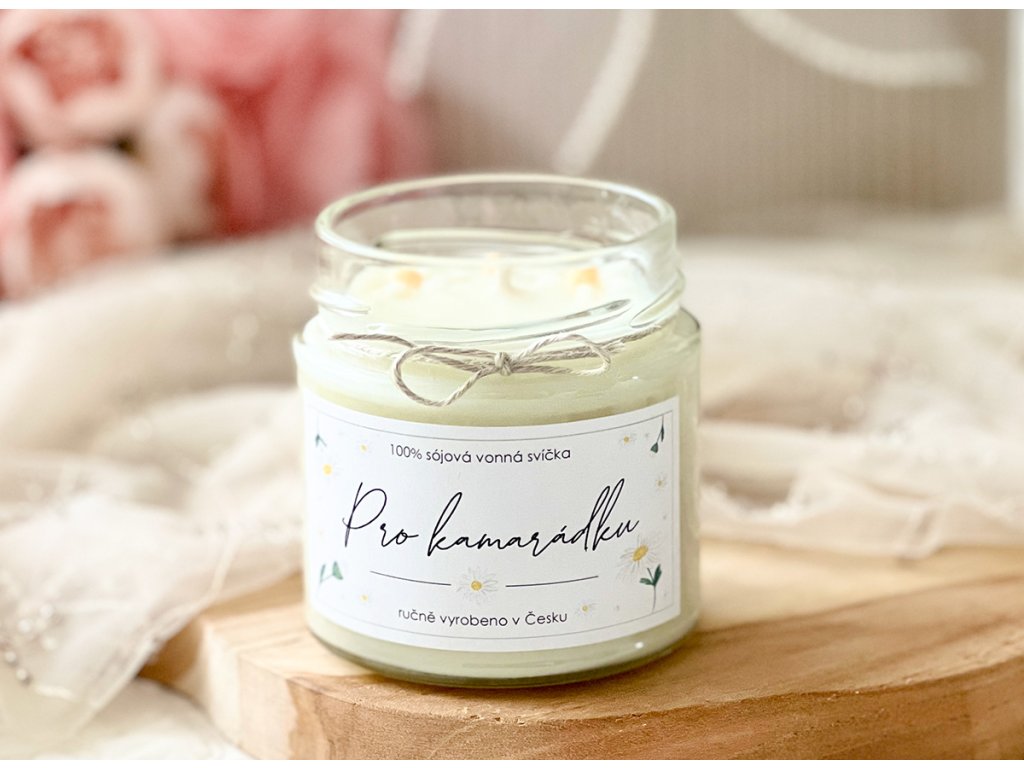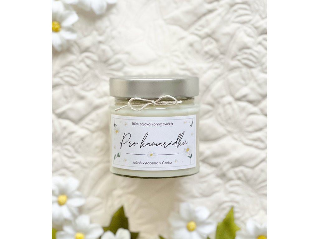 Sójová svíčka ve 210 ml skle s jemnou květinovou vůní, voskovými květy sedmikrásky, bavlněným knotem, stylovým víčkem a dobou hoření více než 35 hodin. Pro výrobu svíčky využívám pouze přírodní sójový vosk bez aditiv.