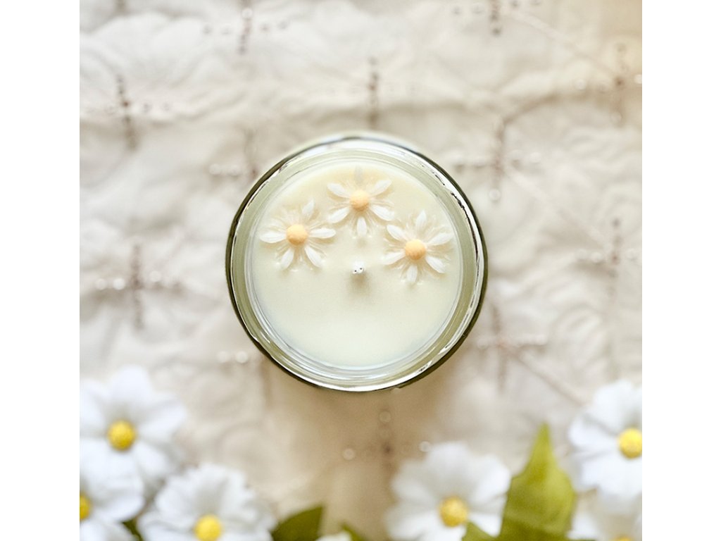 Sójová svíčka ve 210 ml skle s jemnou květinovou vůní, voskovými květy sedmikrásky, bavlněným knotem, stylovým víčkem a dobou hoření více než 35hodin. Pro výrobu svíčky využívám pouze 100% přírodní sójový vosk bez aditiv.
