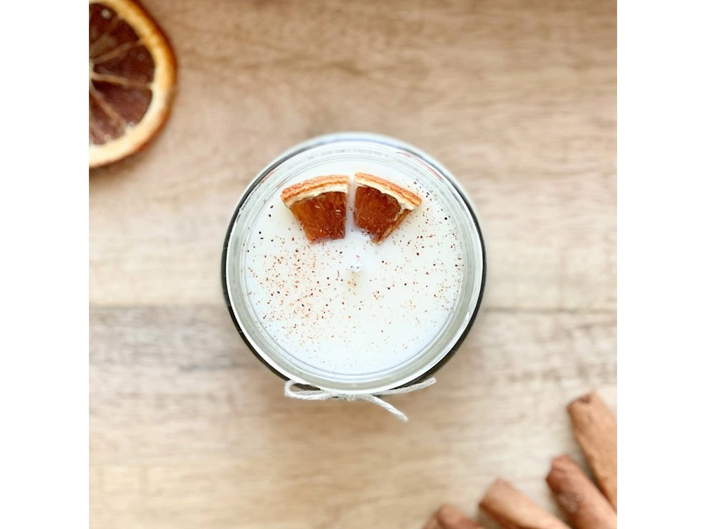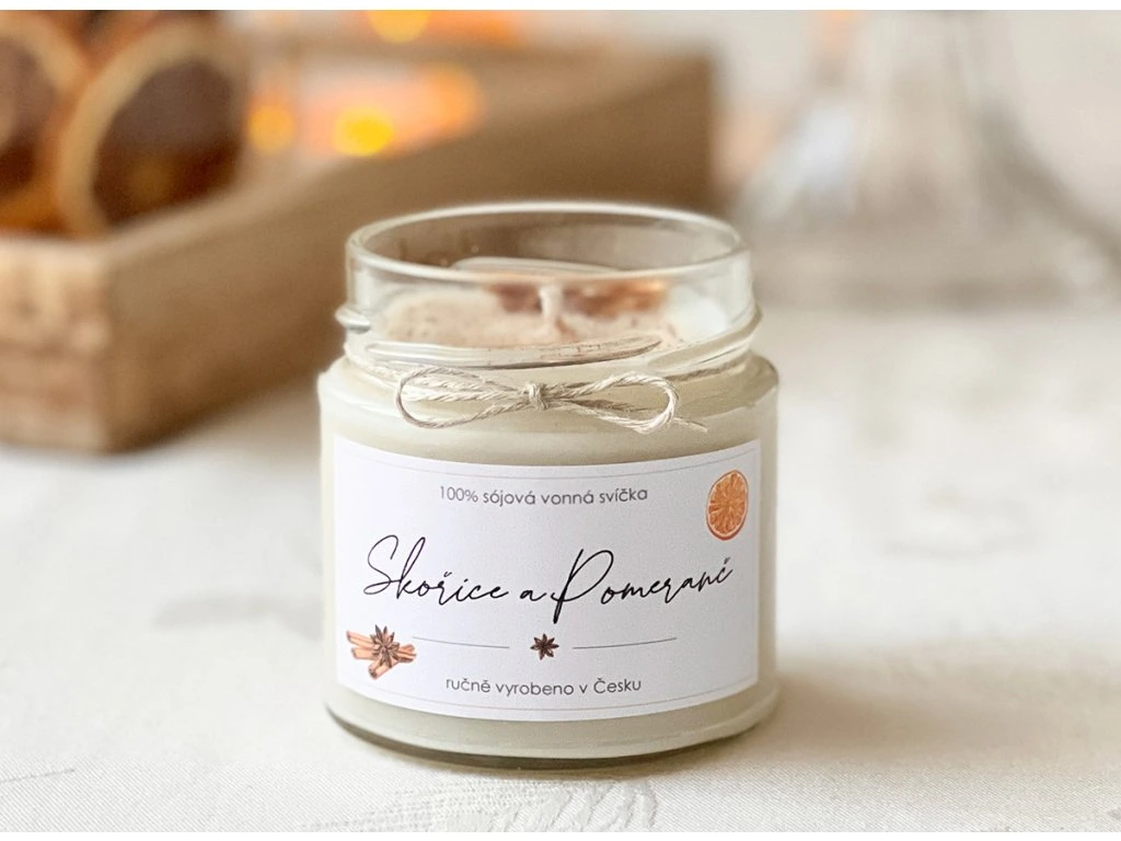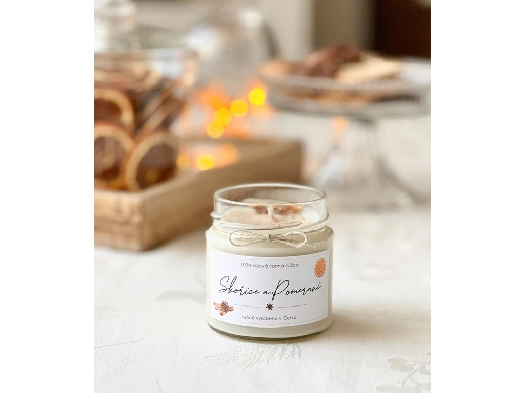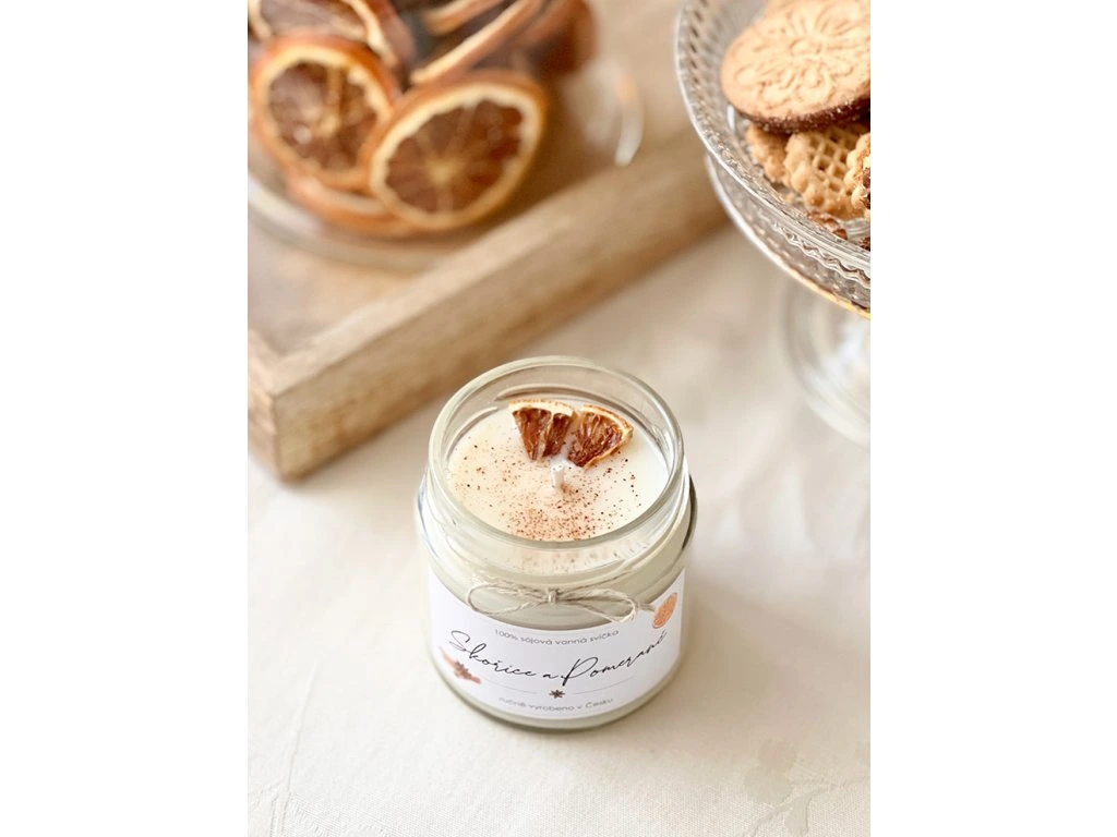 Sójová svíčka v 210 ml skle s hřejivou vůní pomeranče a skořice. Tato vonná svíčka je zdobená sušeným pomerančem, opatřená bavlněným knotem, kovovým víčkem a nabízí dobu hoření více než 35 hodin.